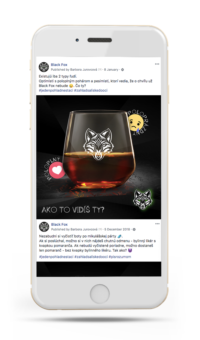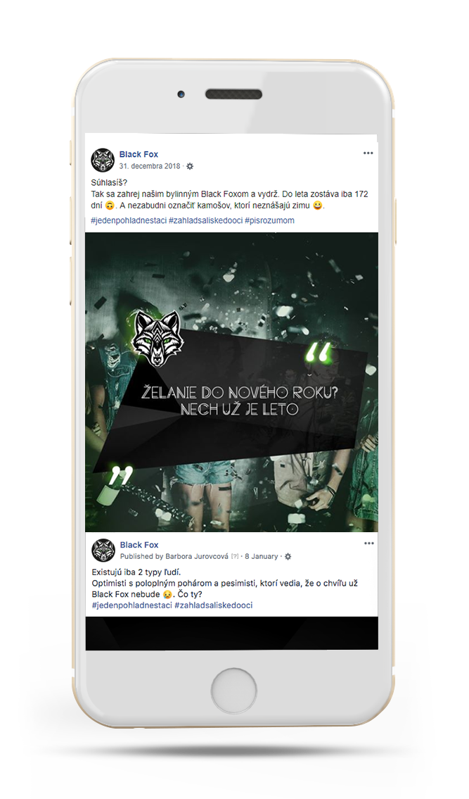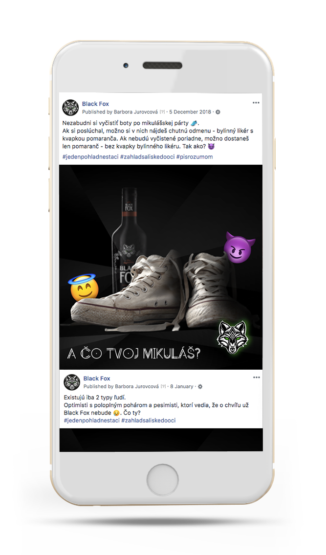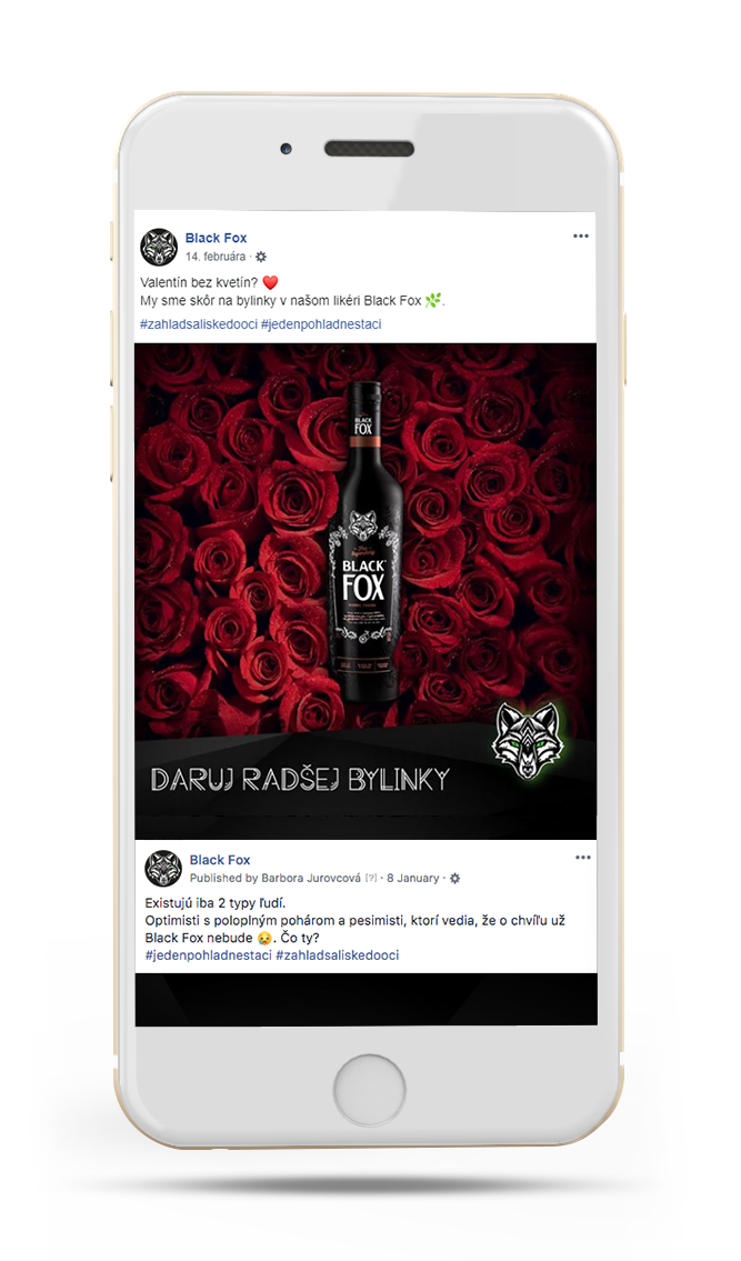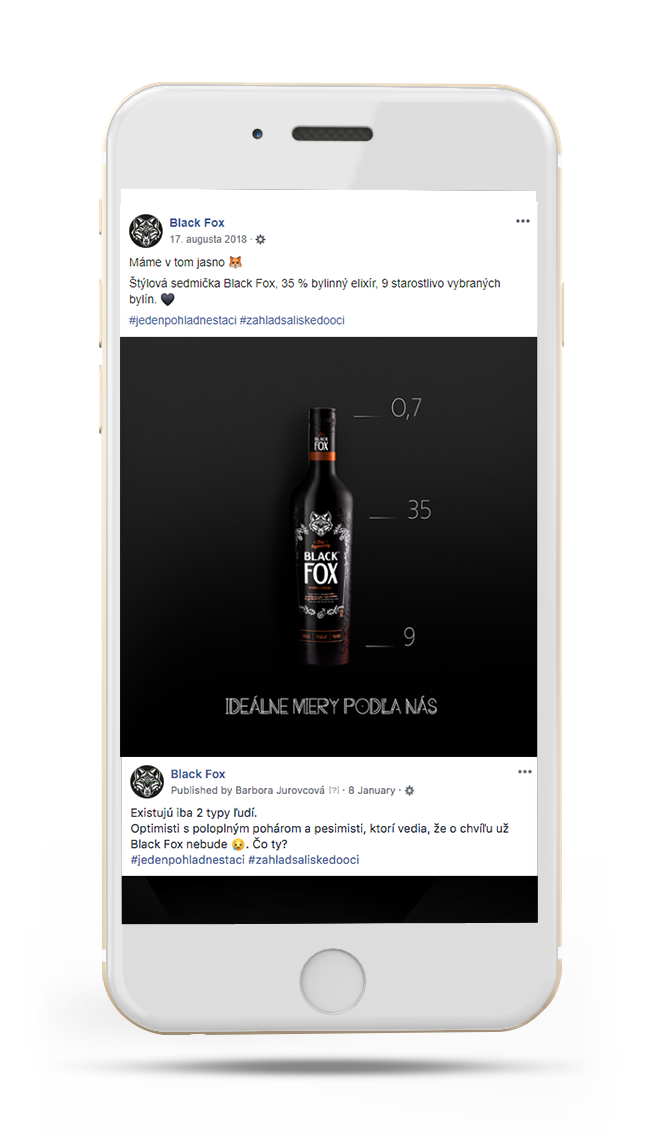 Black Fox, novú značku horko-bylinného likéru, sme uvádzali na trh práve v online – cez komunikáciu na Facebooku a Instagrame. V sériách príspevkov na Facebooku sme pracovali s chytľavými insightami vychádzajúcimi z párty života mladých ľudí, riešili sme témy ako fashion či hudba a nezabudli sme ani na zaujímavé súťaže. Komunikácii na Instagrame predchádzalo niekoľko fotení, z ktorých vzišli letné, zimné či barové série postov.