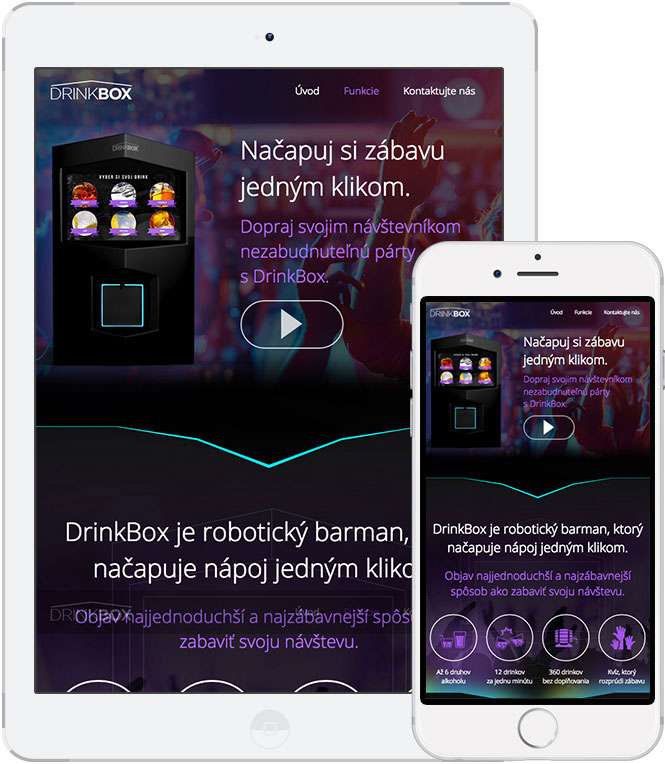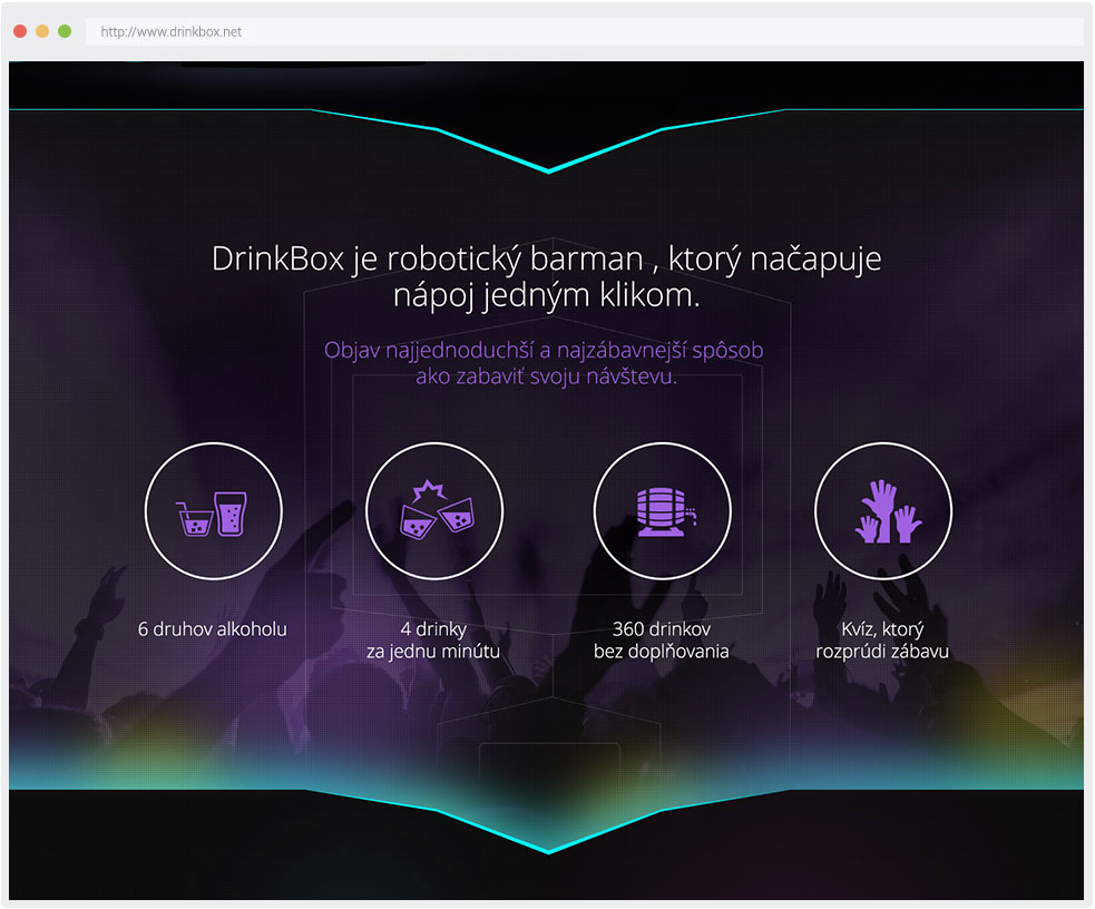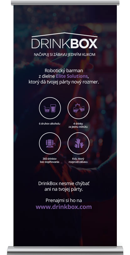 Drinkbox je robotický barman s integrovanou interaktívnou obrazovkou, ktorý dokáže dodať každej párty novú úroveň zábavy. Jeho súčasťou je ,,alkoholový tester,, vo forme customizovaného kvízu na tému danej akcie. Každý drink si tak treba zaslúžiť správnou odpoveďou na tematickú otázku. Drinkboxdokáže dávkovať 6 druhov alkoholu rýchlosťou až 12 drinkov za minútu. Viac info o tomto jedinečnom slovenskom vynáleze nájdete na Drinkbox.net