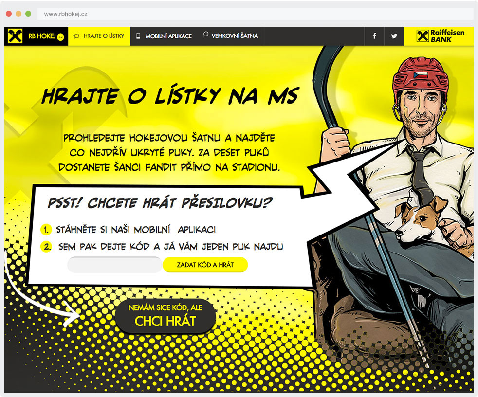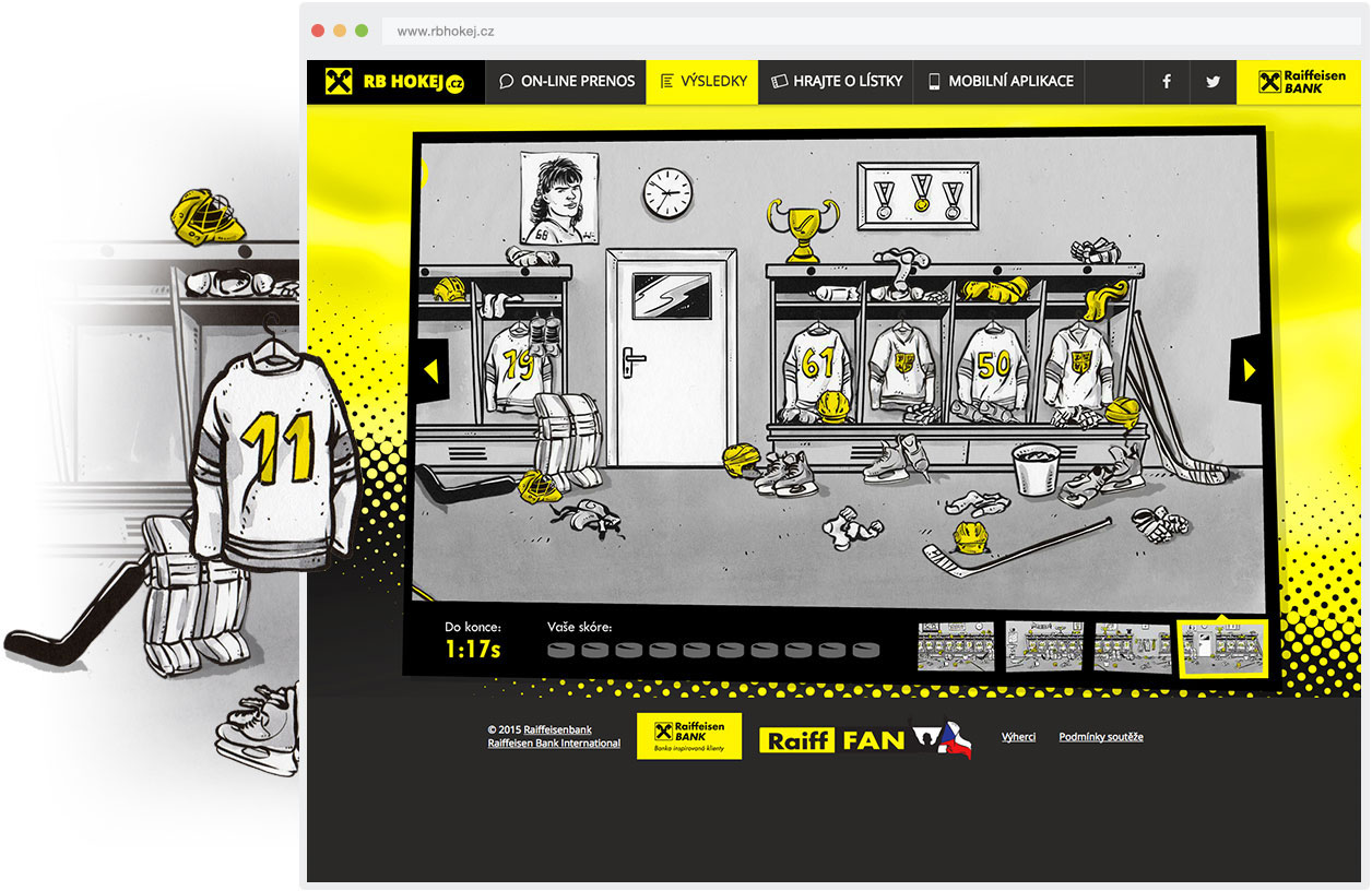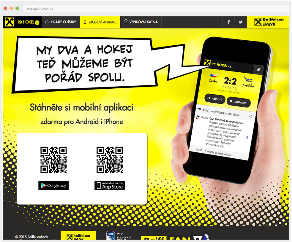 S Raiffeisenbank sme sa nadšene vrhli do víru Majstrovstiev sveta v hokeji 2015. Facebook a Twitter ožili originálnymi postami s hokejovou tematikou, v šatni sme nechali ľudí vyhrávať lístky a tvár firmy – komiksový detektív Artur - komentoval zápasy na webe aj v mobilnej aplikácii.