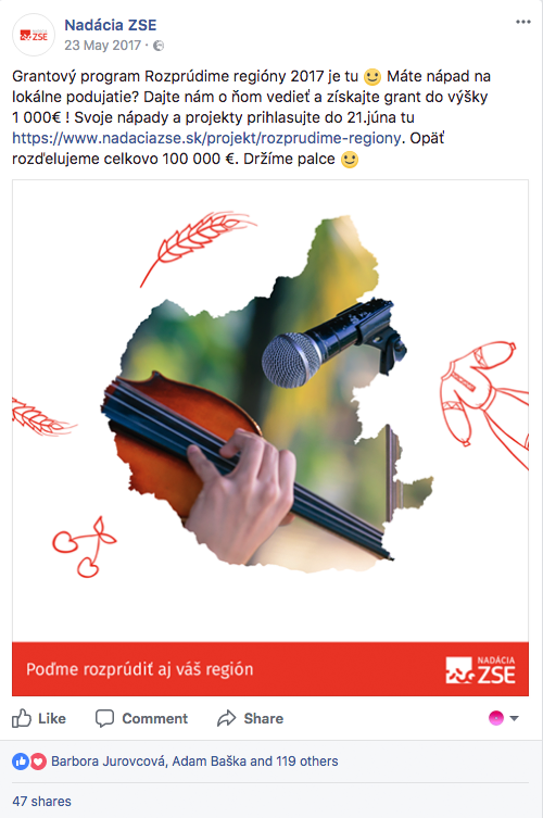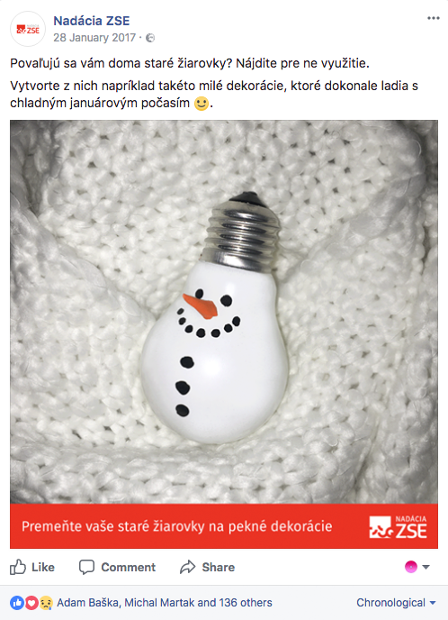 Nadácia ZSE chce svojou podporou vytvárať inšpiratívne a inovatívne prostredie. My ich úsilie už viac ako rok pretavujeme do postov na Facebooku a ľudí tak pravidelne informujeme o kultúrnych, ekologických a vzdelávacích podujatiach v ich okolí.